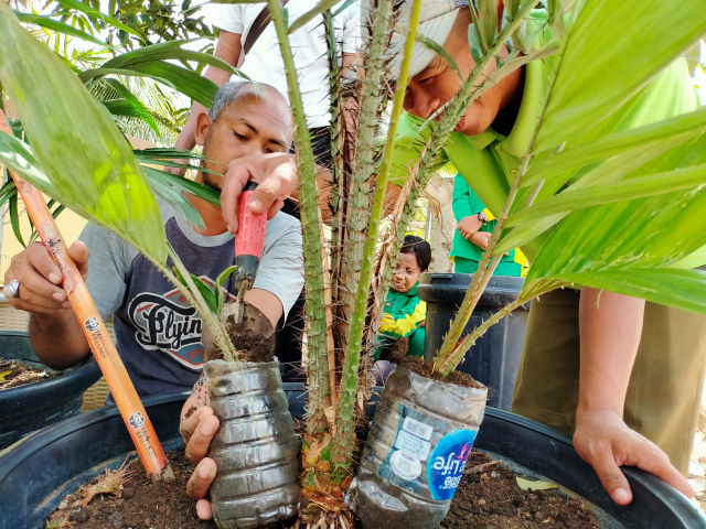 4. Memasang wadah (botol bekas air mineral) pada anakan. Wadah sebelumnya telah dilobangi.