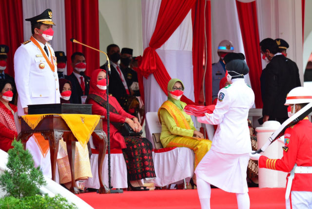 “Kemerdekaan yang telah diraih ini haruslah terus kita jaga dengan sebaik-baiknya dengan cara memupuk rasa persatuan dan kesatuan bangsa, kita harus memaknai kemerdekaan ini dengan semangat pantang menyerah dan semangat kemandirian, sesuai yang digambarkan dalam tema Kemerdekaan Republik Indonesia pada tahun ini yaitu, “Indonesia Tangguh, Indonesia Tumbuh” ujar Gubernur Ansar.