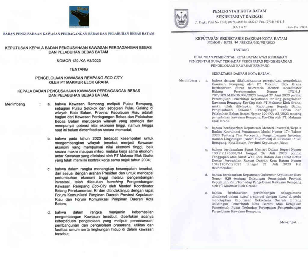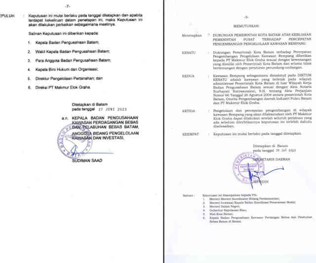 Sedangkan untuk surat persetujuan pengelolaan Kawasan Rempang Eco City dari BP Batam, malah di tanda tangani oleh Anggota Bidang Pengelolaan Kawasan dan Investasi Sudiman Saad tertanggal 27 Juni 2023.