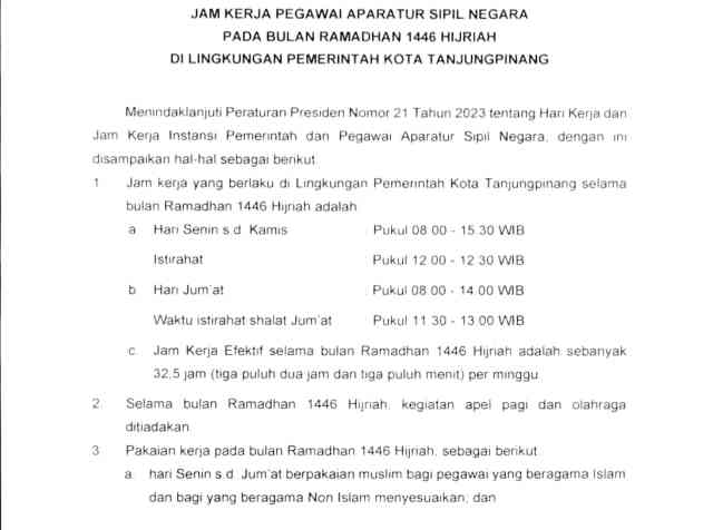 Tanjungpinang, KepriDays.co.id – Pemerintah Kota (Pemkot) Tanjungpinang menyesuaikan jam kerja Aparatur Sipil Negara (ASN) selama bulan Ramadhan 1446 Hijriah.