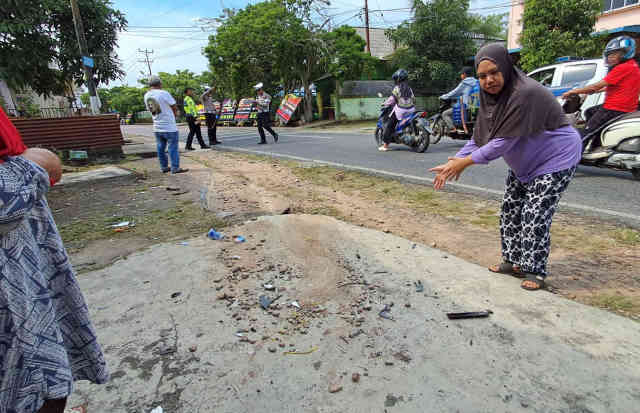 “Ketika pintu gerobak itu dibuka. Saya terdengar suara benturan yang sangat keras. Dubrakk, saya langsung terperanjat,” ujar wanita berhijab hitam ini di lokasi kejadian, Kampung Sei Datok Kijang Kota, Jumat (26/9/2025).